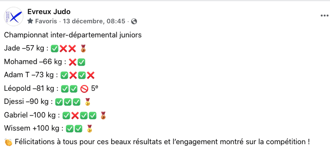 Samedi 6 décembre, se déroulait le 1er tour du championnat interdépartemental juniors à Mezidon (14), auquel participaient 7 judoka Evreux Judo. Au terme de plusieurs combats, Djessy Bukasa Kapinga gagne en -90 kg, ainsi que Wissem Ben Zina en +100 kg. En -57 kg Jade Balez termine 3ème, tout comme Gabriel Badlia Kondi en -100kg. Léopold Salat en -81 kg se classe 5ème après une élimination par hansuku make qui l'empêche de combattre pour le bronze.